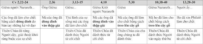 Ở trung tâm của bài giảng là cái chết của Đức Giêsu, nhưng khác với các bản tuyên xưng đức tin và các thánh thi, lời công bố chủ yếu kèm theo việc đóng đinh vào thập giá (4 lần trong số 6 bài): 2 lần với động từ “đóng đinh vào thập giá” (staurôo), 2 lần với thuật ngữ “treo trên cây gỗ” và 1 lần động từ “đóng đinh” (prospègnymi). Việc xác định hình thức cái chết của Đức Giêsu đã có từ lúc đầu, hay là có thể gán cho Luca? Dù sao đi nữa, cách thức phát biểu nhắc đến một phản ứng nằm trong bài giảng tiên khởi của Kitô giáo. Người ta nhận rằng mỗi khi nói đến thập giá (dưới ba dạng thức vừa nói), thì luôn kèm theo sự phục sinh hay suy tôn Đức Giêsu. Sự can thiệp tiêu cực của các nhà cầm quyền Do-thái được đối chọi với sự can thiệp tích cực của Thiên Chúa để bênh vực Đức Giêsu. Người ta cảm thấy một thái độ tự vệ, quan tâm đến việc xác định rằng, nếu Đức Giêsu đã phải chịu chết trên thập giá, thì đó là do sự bất công của loài người chứ không phải là hình phạt của Thiên Chúa. Đặc biệt, ở Cv 5,30 và 10,39, người ta gặp thấy thuật ngữ “treo trên cây gỗ”, được nói đến trong Đnl 21,22-23 (bản dịch Hy-lạp). Đoạn văn này tuyên bố Thiên Chúa chúc dữ kẻ nào mắc phải tội tử hình, bị hành quyết, và thân thể bị treo lên công khai ở trên một cây, nhằm đánh dấu sự sỉ nhục và ngăm đe. Các bản văn của Qumrân (4 QpNahum; 11 QTemple) đã chứng tỏ rằng vào thời Đức Giêsu, người ta đã quen đồng hóa việc chịu đóng đinh vào thập giá với cảnh tượng treo trên cây mà đoạn văn Cựu Ước nói tới. Vì thế, bài giảng tiên khởi dành cho dân Do-thái đã đụng phải vấn nạn là Đức Giêsu bị Thiên Chúa chúc dữ bởi vì chết trên thập giá. Chính thánh Phaolô, trong Gl 3,13, trong một bối cảnh tranh luận với những người theo đạo Do-thái, đã đụng tới vấn nạn này, mà sau này nó còn trở lại ở thế kỷ II, nơi thánh Giustinô (Tryph., 23) và Tertullianô (Adv. Jud., 10). Như thế sự nhấn mạnh của sách Tông đồ Công vụ xem ra là một phản ứng tự vệ chống lại những vấn nạn được nêu lên khi rao giảng cây thập giá: không, Đức Giêsu không bị Thiên Chúa nguyền rủa đâu; ngược lại, Thiên Chúa đã cho Người chỗi dậy từ cõi chết.