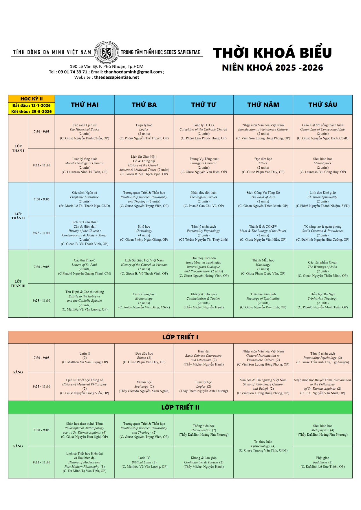 THỜI KHOÁ BIỂU – HỌC KỲ II (2025-2026)